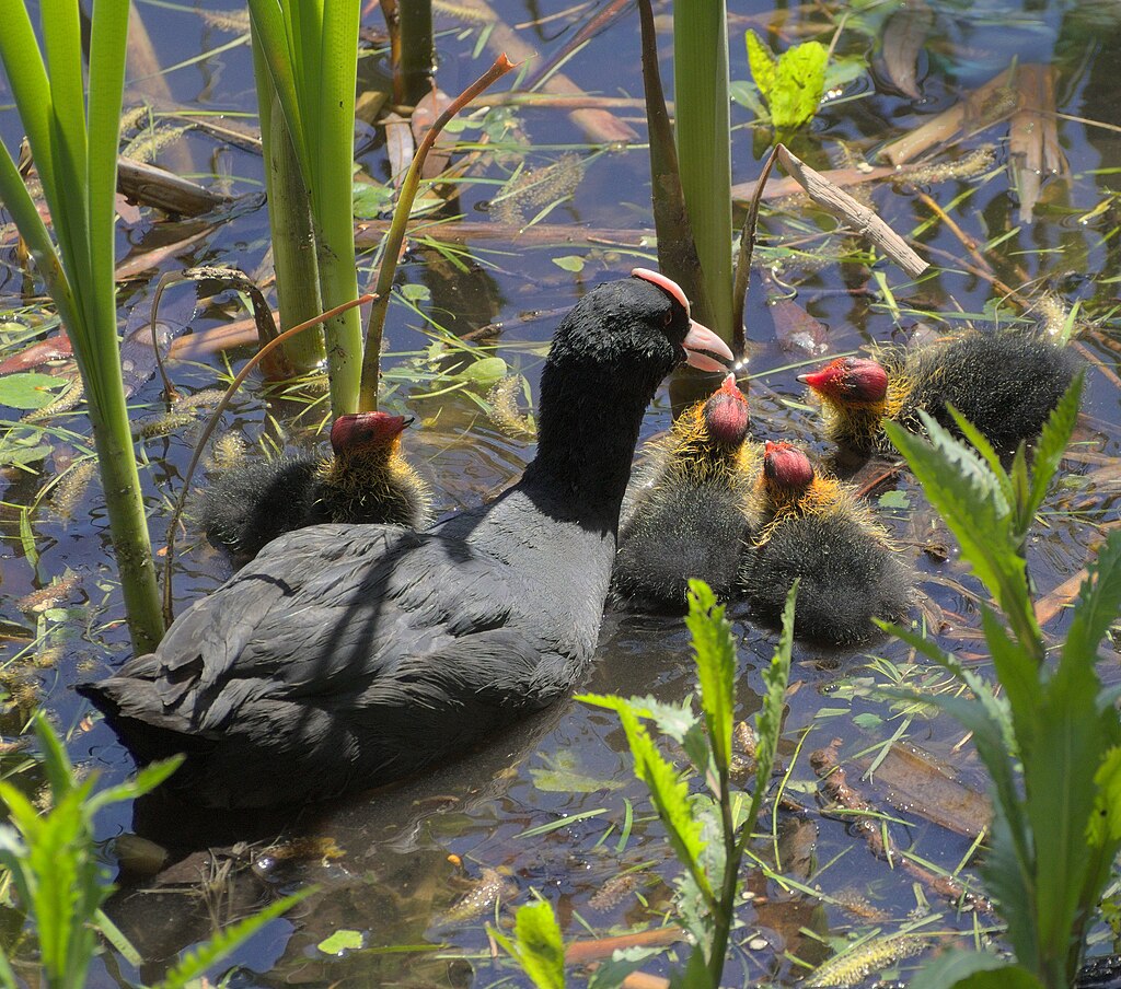 É omnívora, cunha dieta predominantemente vexetariana. Alimenta-se de plantas acuáticas (follas, talos, algas) e gramíneas das beiras, así como de sementes e froitos caídos á auga. Complementa esta dieta con invertebrados acuáticos como caracois, insectos acuáticos e larvas, e incluso pequenos peixes ou cágados en ocasións. Adoita mergullar parcialmente a cabeza ou o corpo enteiro para arrancar plantas submersas. Tamén pastorea pola beira das masas de auga en superficies encharcadas en busca de brotes tenros. Esta flexibilidade alimentaria contribúe a que sexa unha especie tan exitosa en distintos humidais.